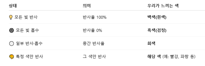 | 물체색은 👉 물체에 빛이 비쳤을 때, 그 물체가 어떤 파장의 빛을 반사하고, 어떤 빛을 흡수하느냐에 따라 우리가 느끼는 색입니다. 즉,
