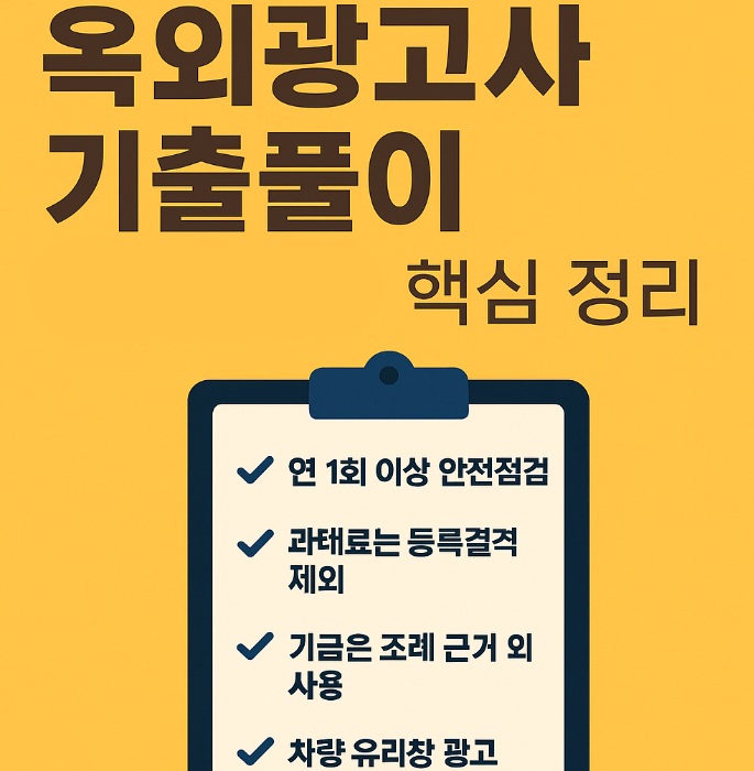 옥외광고사 시험의 안전관리, 등록취소 사유, 광고발전기금, 법령 규정은 매년 반복적으로 출제되는 중요한 영역입니다. 이번 글에서는 기출문제 12번부터 15번까지를 원문과 함께 정답 및 해설을 정리하고, 마지막에 핵심 요약을 담았습니다.12번. 옥외광고물 안전점검 실시 주기문제 원문풍수해 등에 대비한 옥외광고물 안전점검 실시 주기로 맞는 것은?가. 분기별 1회 이상 안전점검을 실시 하여야 한다.나. 반기별 1회 이상 안전점검을 실시 하여야 한다.다. 연 1회 이상 안전점검을 실시 하여야 한다.라. 2년 단위 1회 이상 안전점검을 실시 하여야 한다.정답: 다. 연 1회 이상 안전점검핵심 요약:옥외광고물은 안전사고 예방을 위해 연 1회 이상 정기적으로 안전점검을 실시해야 한다. 13번. 옥외광고업 등록 결격사..